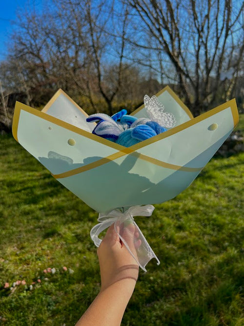 Bouquet de fleurs bleues avec des paillettes et un emballage