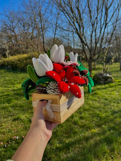 Boite décorative avec fleurs rouges, vertes et blanches et leds à piles